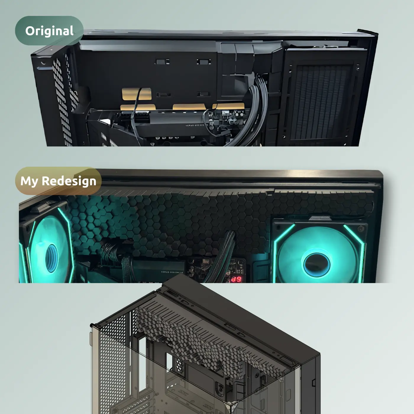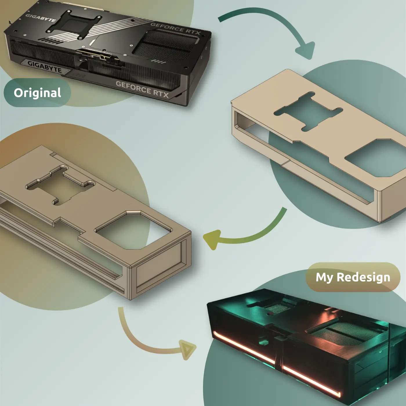 This project focused on enhancing the aesthetics of my PC, particularly focused on covering up some features I did not want to see. The redesigned grommet cover and GPU shroud were reverse engineered based on the original part, before I redesigned them to remove the logo-heavy styling and better match the overall vibe of the build.